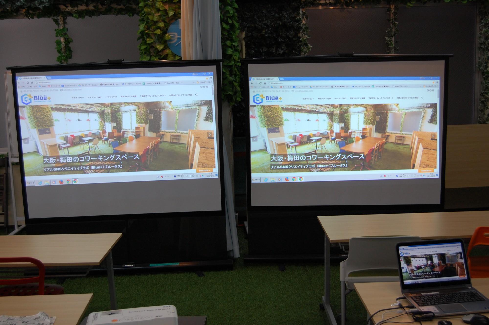 最近、うれしいことにプロジェクターやスクリーンをつかってくださってる利用者の方が非常に多いのですが、、スクリーン2台とプロジェクター2つ使って、こんな風に映像を流したり、会議をしたりできます。
