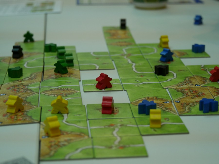 タイルを配置して道・城・修道院をつくり、なるべく多くの得点を得る、ということで5人のプレーヤーと争いながら、ときには協力してゲームを進行しながら自分の領地を発展させていくのがとても楽しかったです。