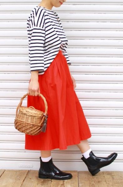 ボーダーにオレンジのロングフレアスカートを合わせた大人可愛い梅雨ファッションコーデ。