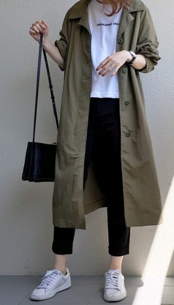 白のTシャツと黒スキニーに合わせ、カーキの薄手コートを羽織った大人カジュアルコーデ。