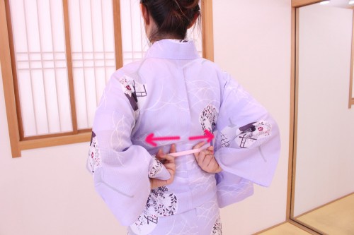 腰紐を右腰骨にあて、後ろで交差させて両脇で締め、腰紐を結びます。
