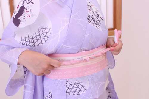 集めたたるみを隠すように伊達締めを結んでできあがりです。