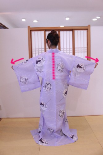 そして、左右の袖口を持って両袖を引き、背中の縫い線が体の真ん中にくるように、左右のバランスが同じになるよう調節しましょう。