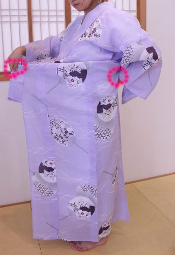 上前(実際に浴衣を着たときに一番上になる面)の幅を決めます。ピッタリ右の脇までくるように、上前の幅を調節しましょう。
