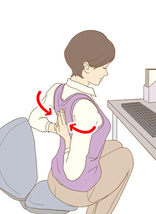 背すじをまっすぐ伸ばして、背中で両手の指をひっかけたら、そのままの姿勢で深呼吸を行います!