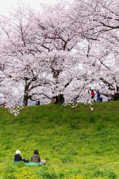 堤防を降りて、芝生の上でのんびりと桜を眺めるのも良し。